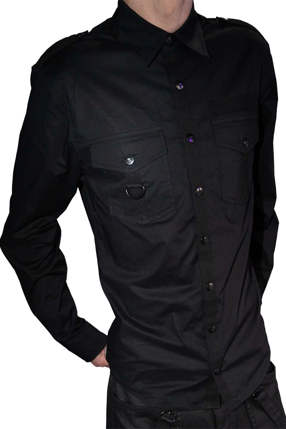 Lip Service Black Ops Military Work Shirt. Under cover of darkness you'll slip through the streets in your own military fashion show! This classic snap front stretch cotton shirt with just a few bondage details will add just enough fetish to your look!!! Twill tape epaulettes and stealth black button reinforcement!