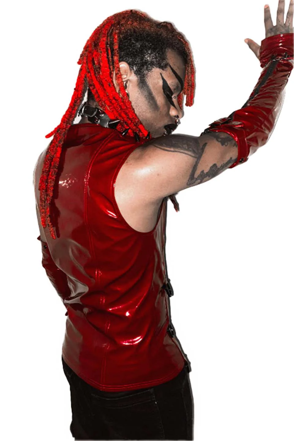 Men's Dungeon Master Sleeveless Vinyl PVC Shirt in Vampire Red
