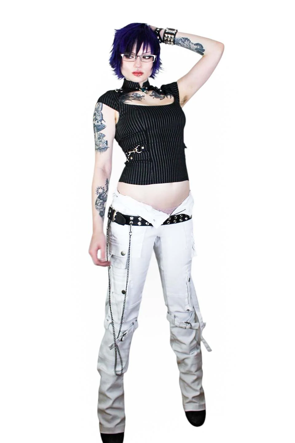 Lip Service Pinstriped Gangsta Pranksta Lock Top! This classic is back. Previously known as Fedora Fanny's Rustle Me Up Top, it has hook n' strap details at the waist and shoulder, padlock at the collar, cap sleeves, a front cut-out detail and zipper up the back. Lock Comes w/ Keys!! Bust measurement is more of an underbust measurement so lots of room in the bust! Now in plus sizes!